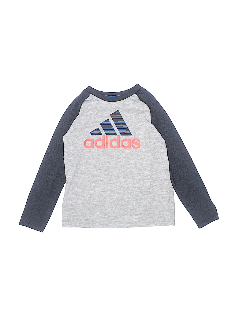 - Long sleeves, crew neckline, graphic print, color blocked detail, gray