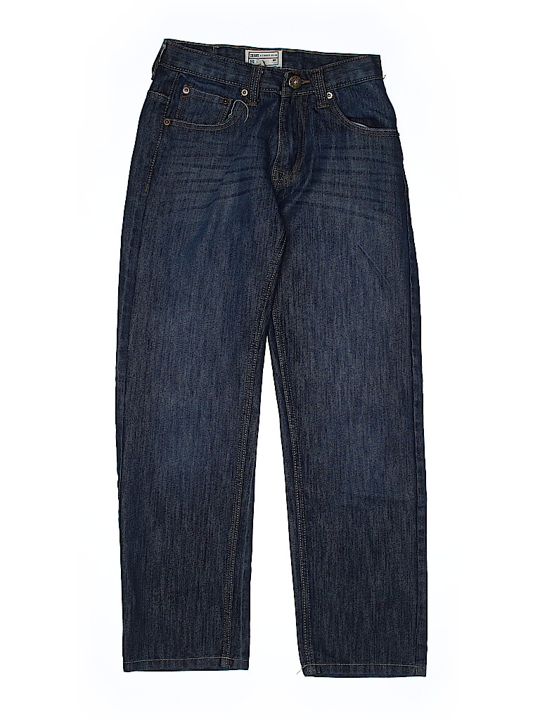 - Solid, blue, dark wash, straight leg cut