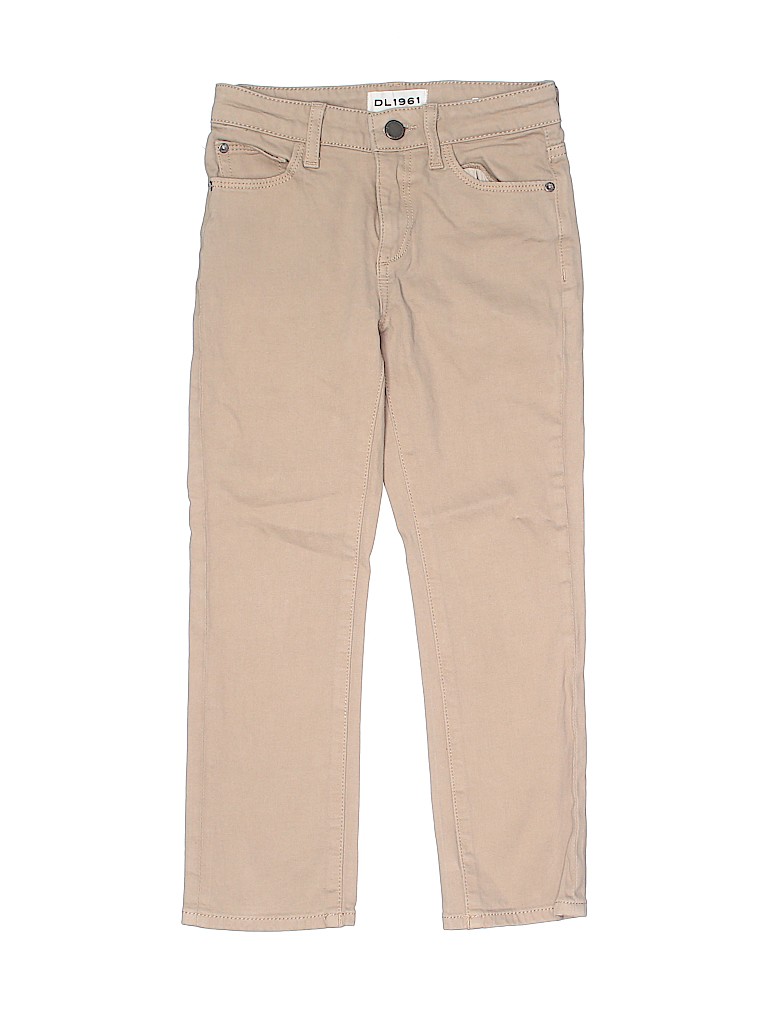 - Solid, tan, colored denim, straight leg cut, adjustable waist