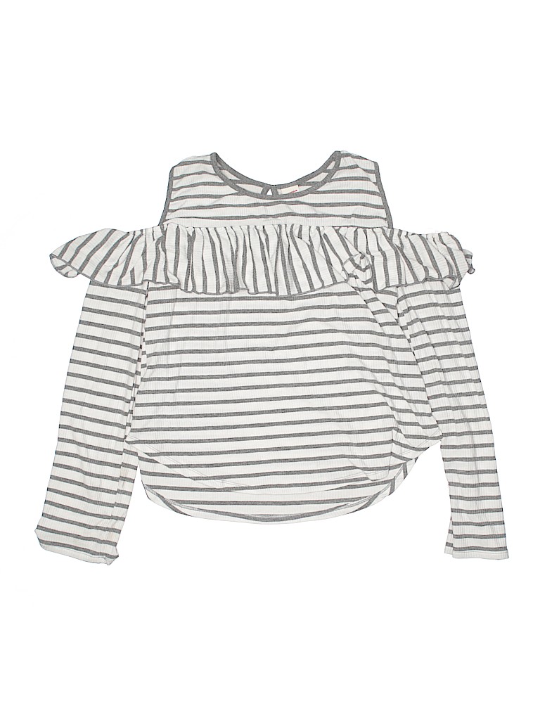 - Long sleeve, striped print, ruffle accents, gray