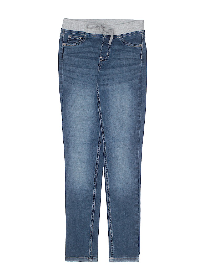 - Solid, blue, medium wash, elastic waist