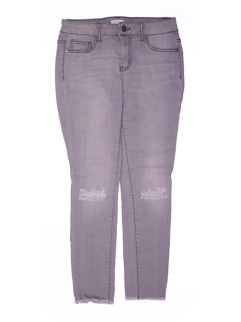 - Solid, ripped, frayed edges, gray, colored denim, distressed detail