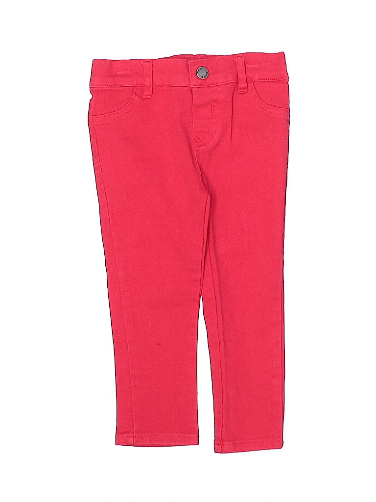 - Solid, red, skinny leg cut, elastic waist