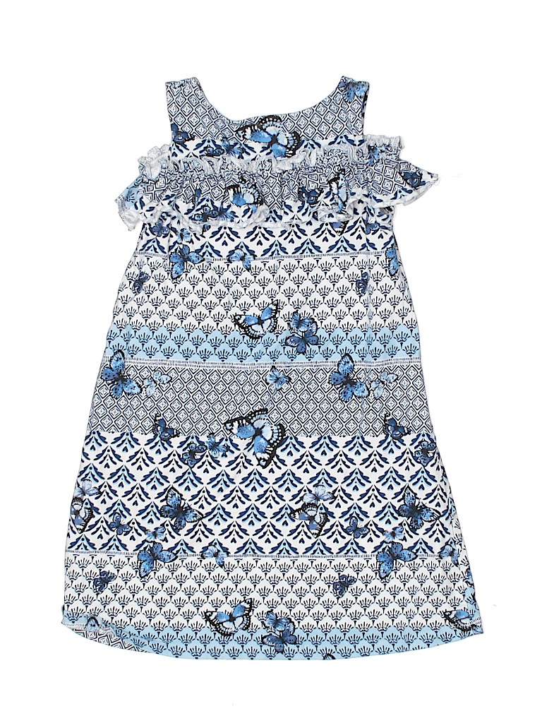 - Boat neckline, printed, ruffle accents, blue