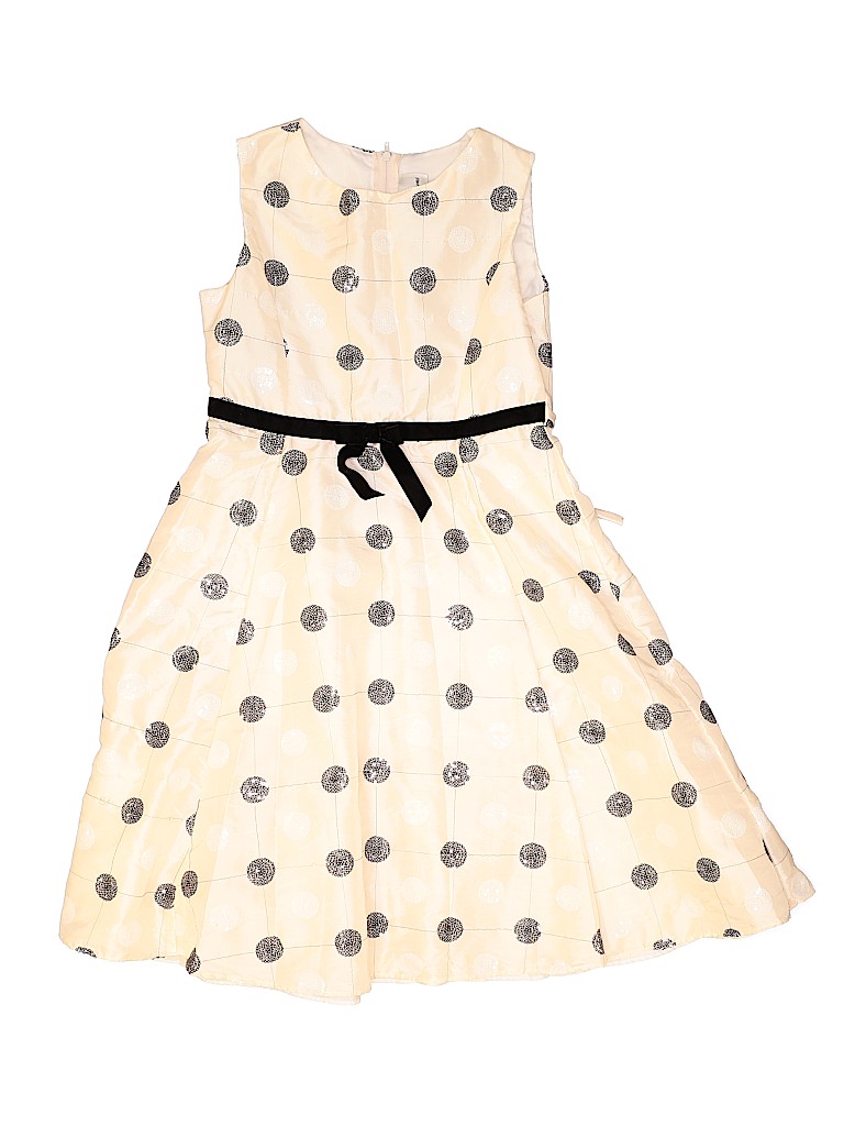 - Crew neckline, a-line silhouette, polka dot print, bow accents, ivory