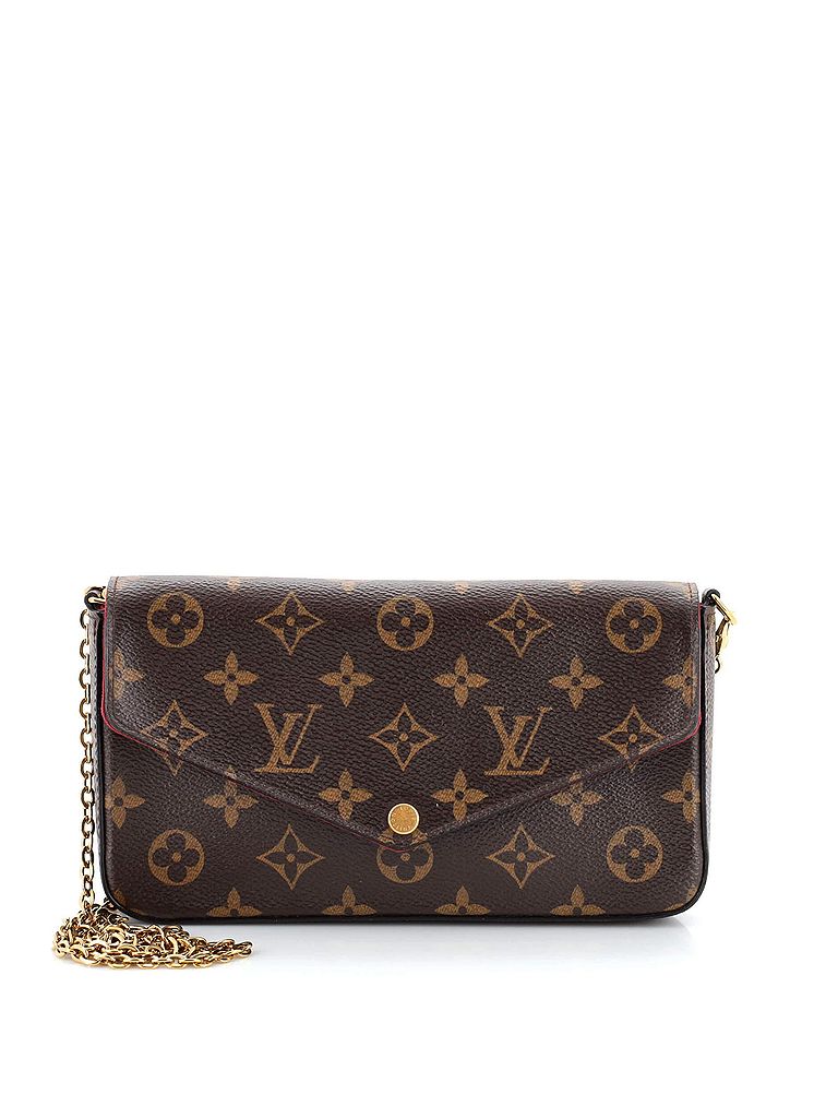 - Exterior Color: brown | Interior Color: red | Exterior Material: Canvas Coated | Interior Material: Fabric | Hardware Color: Gold | Accessories: Detachable StrapStrap Length: 21 | Item No: 239790/1 | CLAIRE CODE: HB.LV.FELP.MNCA