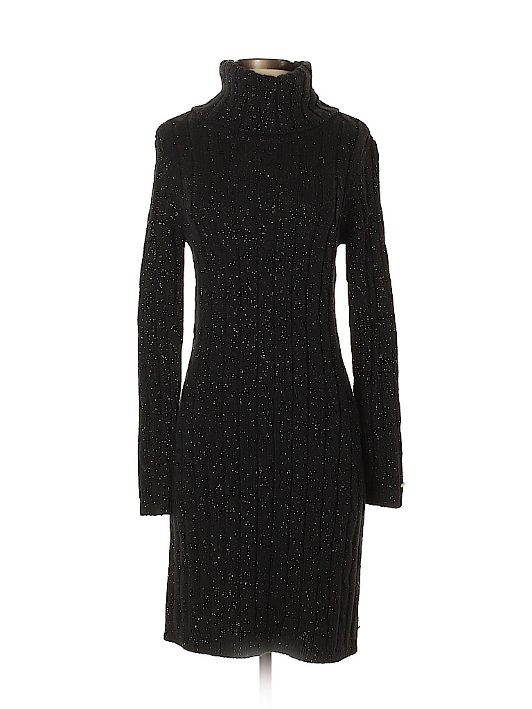 - 3-4 sleeves, turtleneck neckline, sheath, solid, glitter accents, black, midi-calf length