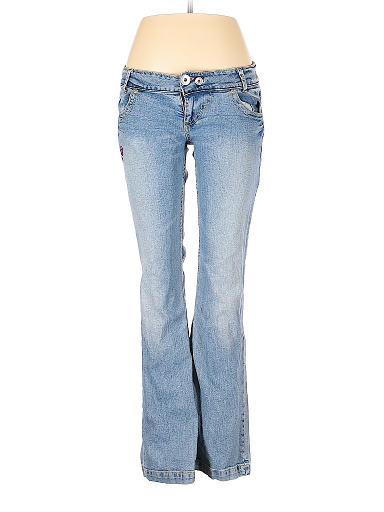 - Blue, low rise waist