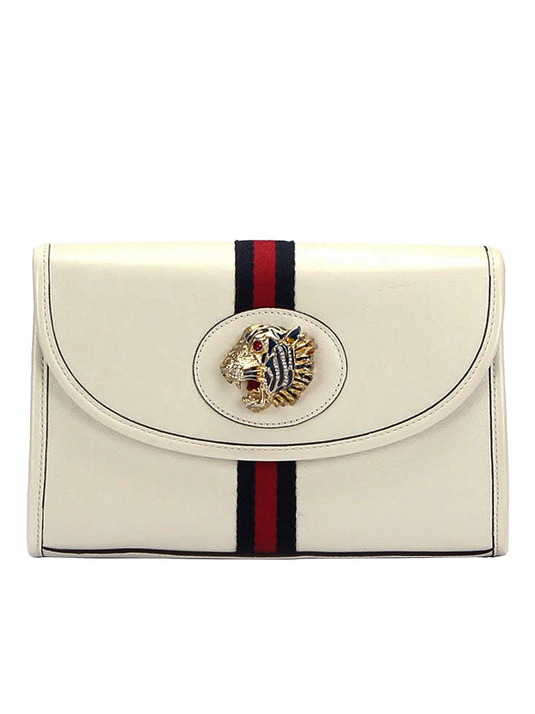 • The Rajah shoulder bag features a leather body, a chain strap, a detachable rolled strap, a web detail, a flap with magnetic button closure and interior slip pocket.
