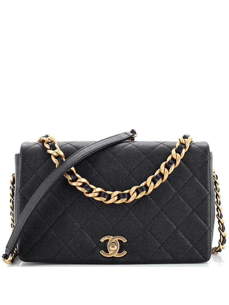 - Exterior Color: black • Interior Color: pink • Exterior Material: Leather • Interior Material: Fabric • Hardware Color: Gold • Accessories: Dust Bag, Authenticity Card • Strap Length: 22 • CLAIR CODE: HB.CH.FSG.QCA.ME