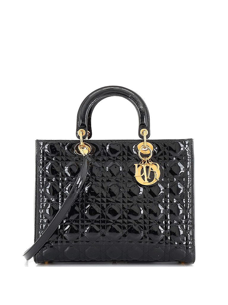 - Exterior Color: black | Interior Color: black | Exterior Material: Patent Leather | Interior Material: Nylon | Hardware Color: Gold | Accessories: Detachable StrapStrap Length: 17.5 | Item No: 241364/1 | CLAIRE CODE: HB.DI.LD.CQUP.LG