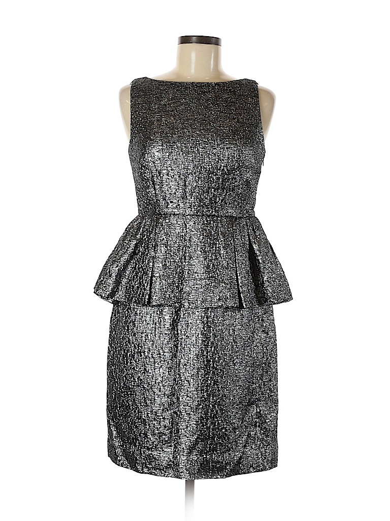 - Sleeveless, boat neckline, sheath, metallic detail, peplum silhouette, silver, knee length